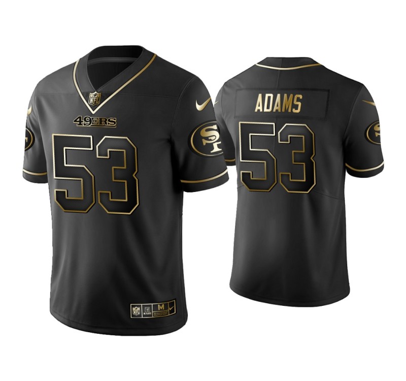 Every fan has various pieces of fan apparel that are a little different from the standard clothing that makes up most of their wardrobe or collection, and this Men San Francisco 49ers #53 Golden Edition 49ers Tyrell Adams Black Jersey will definitely stand out from the others. The Gold Vapor Untouchable Limited jersey design includes a golden team graphics screen-printed on the front and on both sleeves, the golden player's name and number on the the front and back.