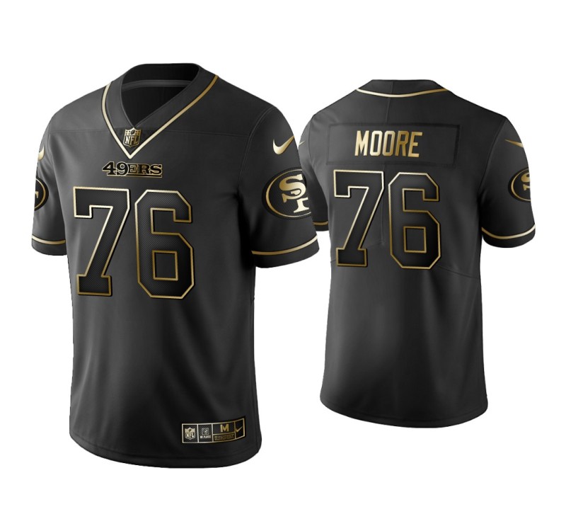 Every fan has various pieces of fan apparel that are a little different from the standard clothing that makes up most of their wardrobe or collection, and this Men San Francisco 49ers #76 Golden Edition Vapor Limited 49ers Jaylon Moore Black Jersey will definitely stand out from the others. The Gold Vapor Untouchable Limited jersey design includes a golden team graphics screen-printed on the front and on both sleeves, the golden player's name and number on the the front and back.